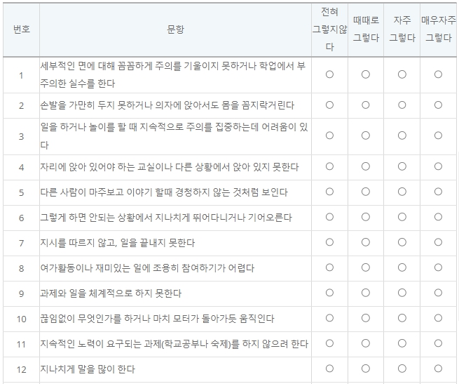 아이 ADHD검사는 정확도를 높이기 위해, 부모나 선생님이 설문에 답변하는 검사지가 따로 있습니다. 보호자용 ADHD검사지를 함께 체크하셔서 ADHD진단결과의 정확도를 높이시기 바랍니다.