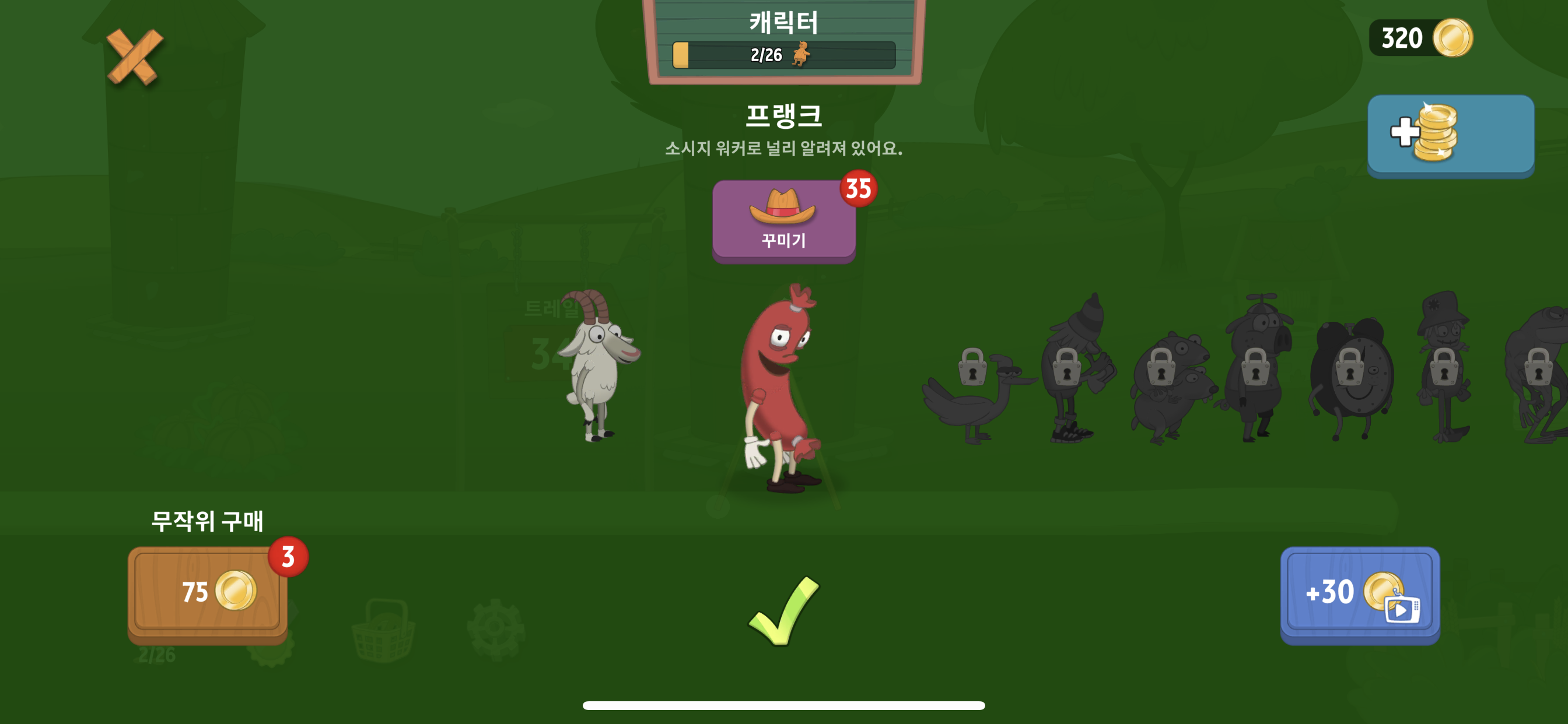 다양한 배경들이 있고 또 캐릭터도 다양하게 있는데 무작위로 구매를 할 수도 있어서 또 다른 느낌을 낼 수 있다는 것이 장점으로 꼽히는 것 같다. 하지만 개인적으로 프랭크라는 이름을 가진 소세지는 앞으로 몸이 기울어져 있기 때문에 중심을 잡기에 불편하게 느껴져서 좋지 않은 것 같다. 기본적으로 처음에 게임을 할 때 주는 염소 캐릭터가 가장 마음에 들었고 나머지는 개개인의 기호에 맞게 다른편인 것 같다. 하지만 그래도 색다른 느낌으로 또다시 즐길 수 있다는 것은 큰 장점. 온라인게임순위 100안에 들만큼 가벼우면서도 흥미롭게 플레이 할 수 있는 게임이라 좋은 것 같다.