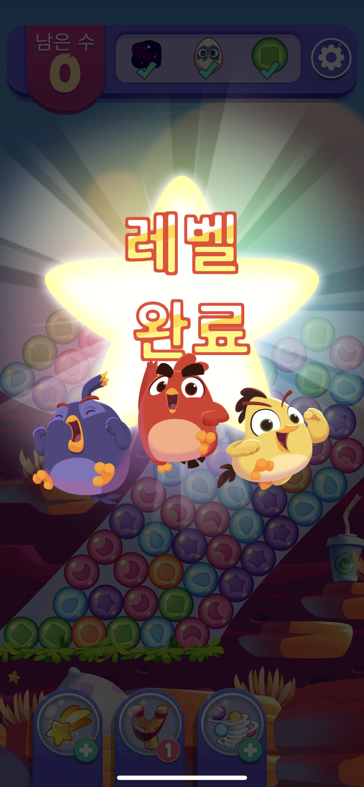 게임을 성공하고 한판을 깨게 되면 귀여운 새 3마리가 나와서 뛰면서 승리를 만끽하는데 그 모습도 굉장히 귀엽게 느껴진다. 한판 깰때마다 나와서 자기들이 기뻐해주니까 괜히 그런 모습을 보고 싶어서 더 빨리 게임을 깨게 되는 것도 있기도 한 것 같다. 사진들을 훑어보면 알겠지만 4개 이상 연결되어 있는 구슬들이 초반에는 꽤 많이 나오기 때문에 고민을 하거나 크게 어려워하지 않고도 쉽게쉽게 다음판으로 넘어갈 수 있다는 부분에서 재미를 느끼게 되는 것 같다. 개인적으로 게임은 즐기면서 스트레스를 적절히 풀기 위해서 하는 것이지 머리를 많이 써야하거나 어려운 게임들은 좋아하지 않는 편이라서 더 그런 것 같다.