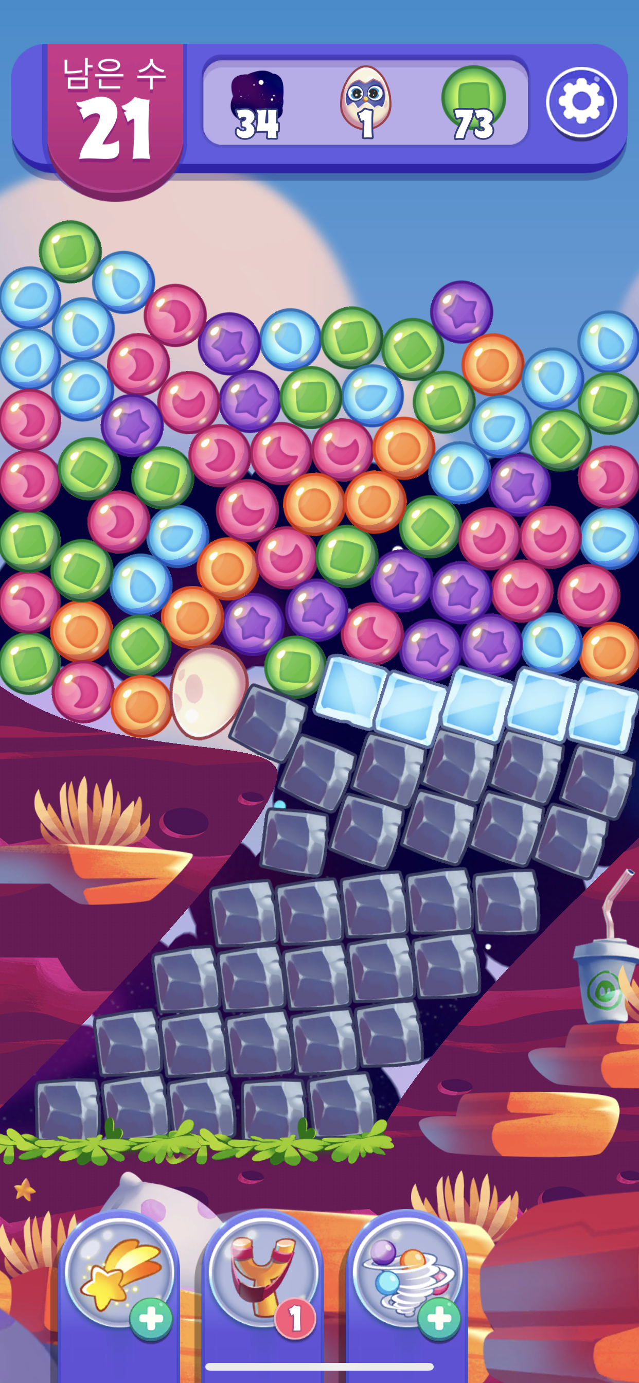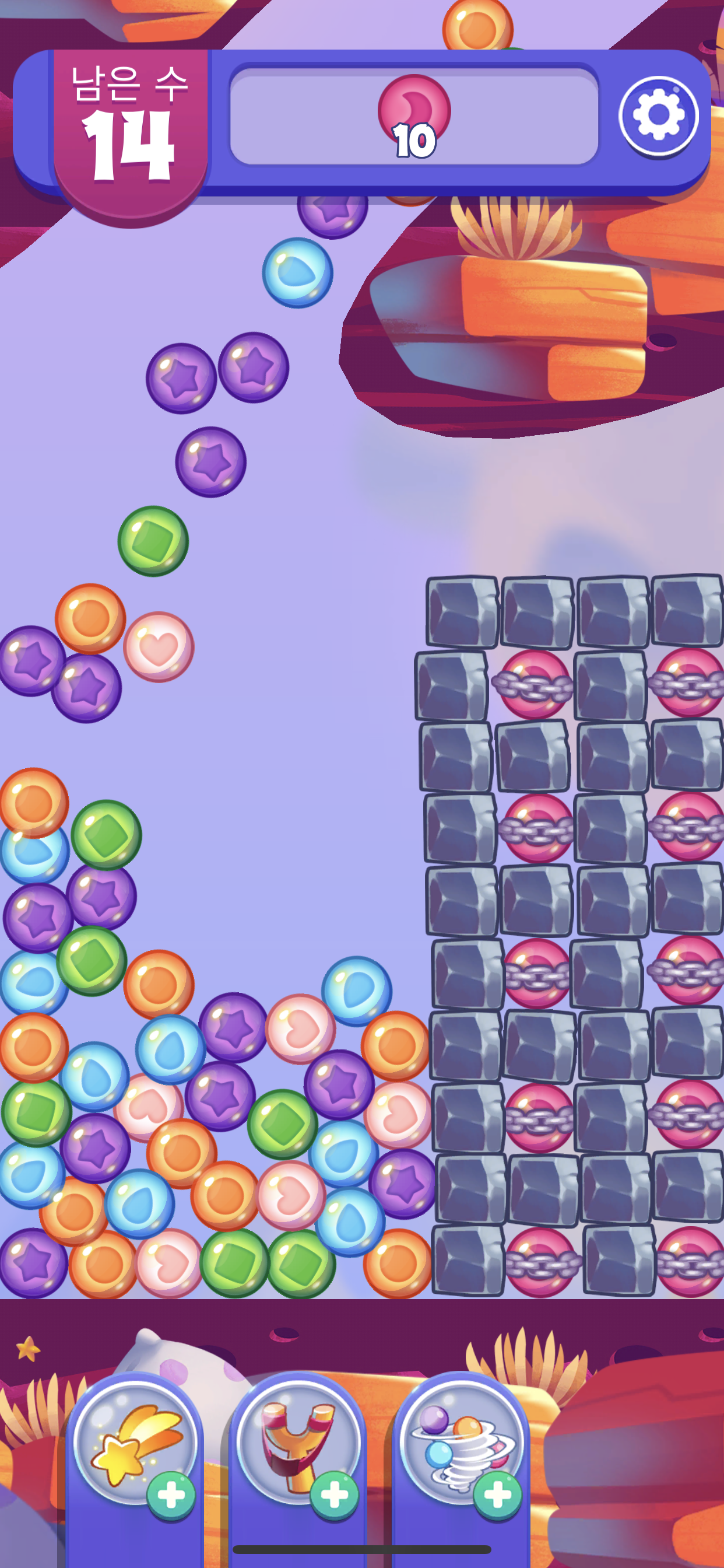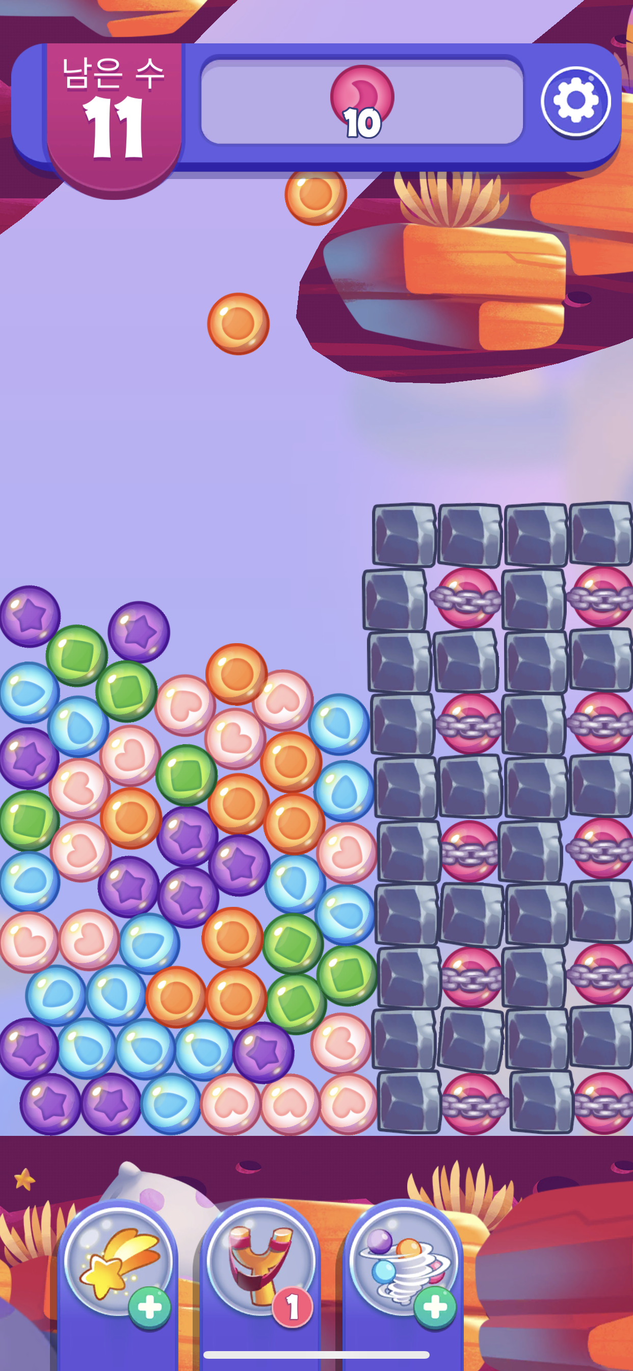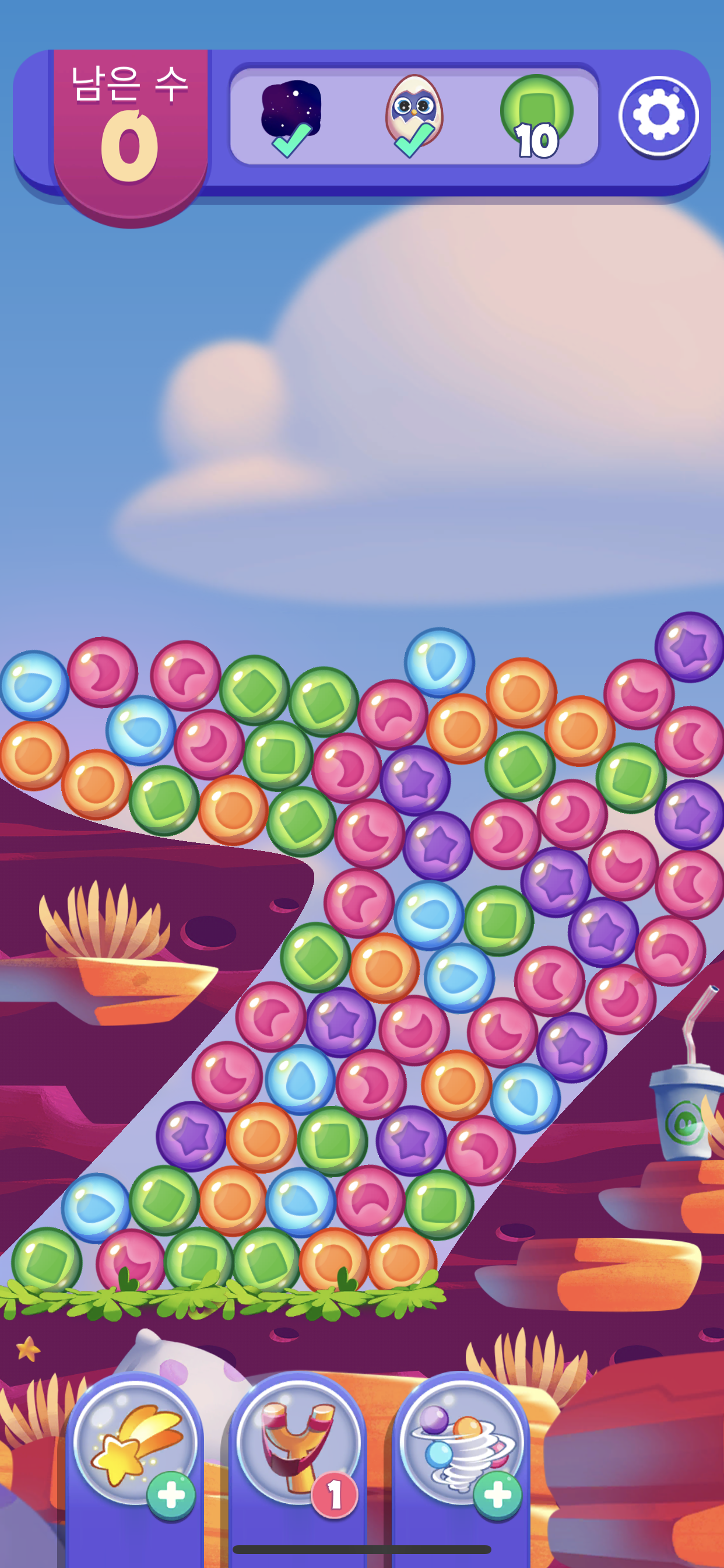 재미있는 게임은 이렇게 하늘에서 구슬들이 도로록 굴러 떨어지는 것을 볼 수 있었는데 이미지 자체도 너무 어리거나 또 너무 실사화 되어 있지않고 딱 적당해서 게임을 하는게 거슬리거나 불편하다는 늒낌은 전혀 없었다. 물론 이런 부분은 사람마다 조금씩 다르게 느낄 수 있기도 하지만 말이다. 그리고 하단부에 보면 특정한 기능이 있는 것 같은 아이템들이 세가지 보이는데 게임을 하면서 레벨업을 하거나 할 경우에 하나씩 보너스로 제공을 해주는 것 같았다. 초반에는 딱히 사용할 필요성을 느끼지 못해서 사용하지는 않았었지만 특정한 난관에 봉착했을때는 한두개씩 사용하는것이 굉장히 편리하고 유용하게 느껴져서 아이템을 얻을 때마다 사용하고는 한다.