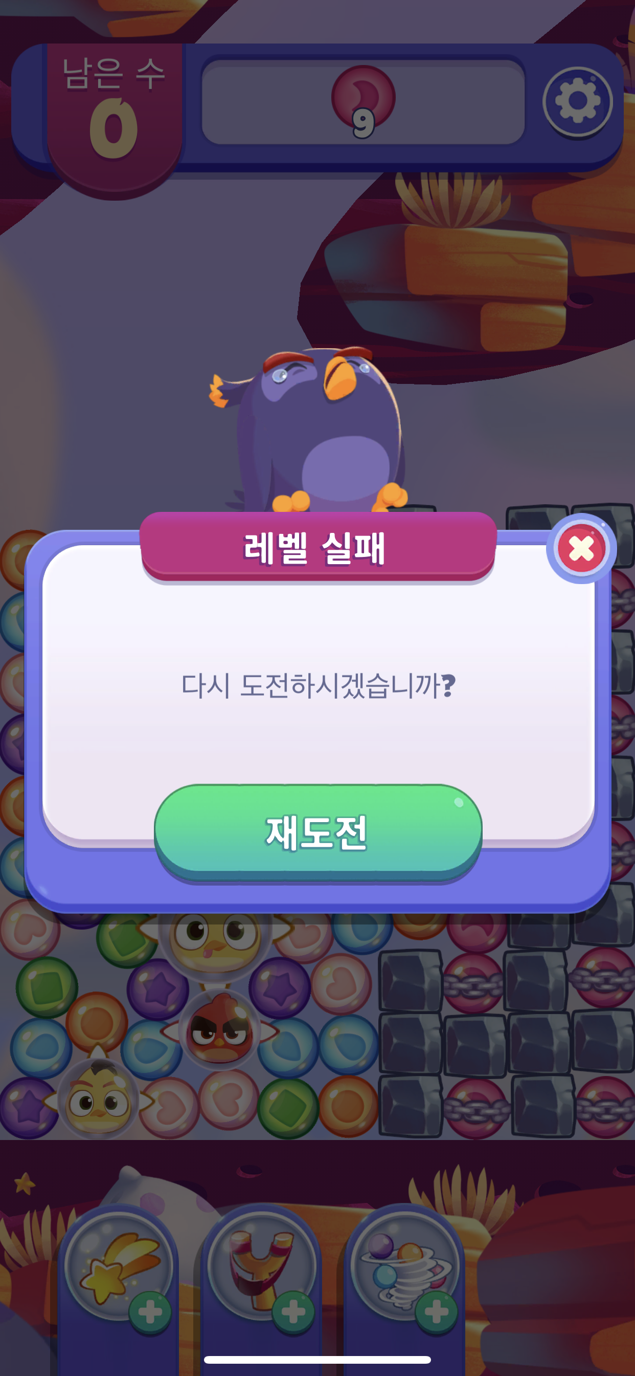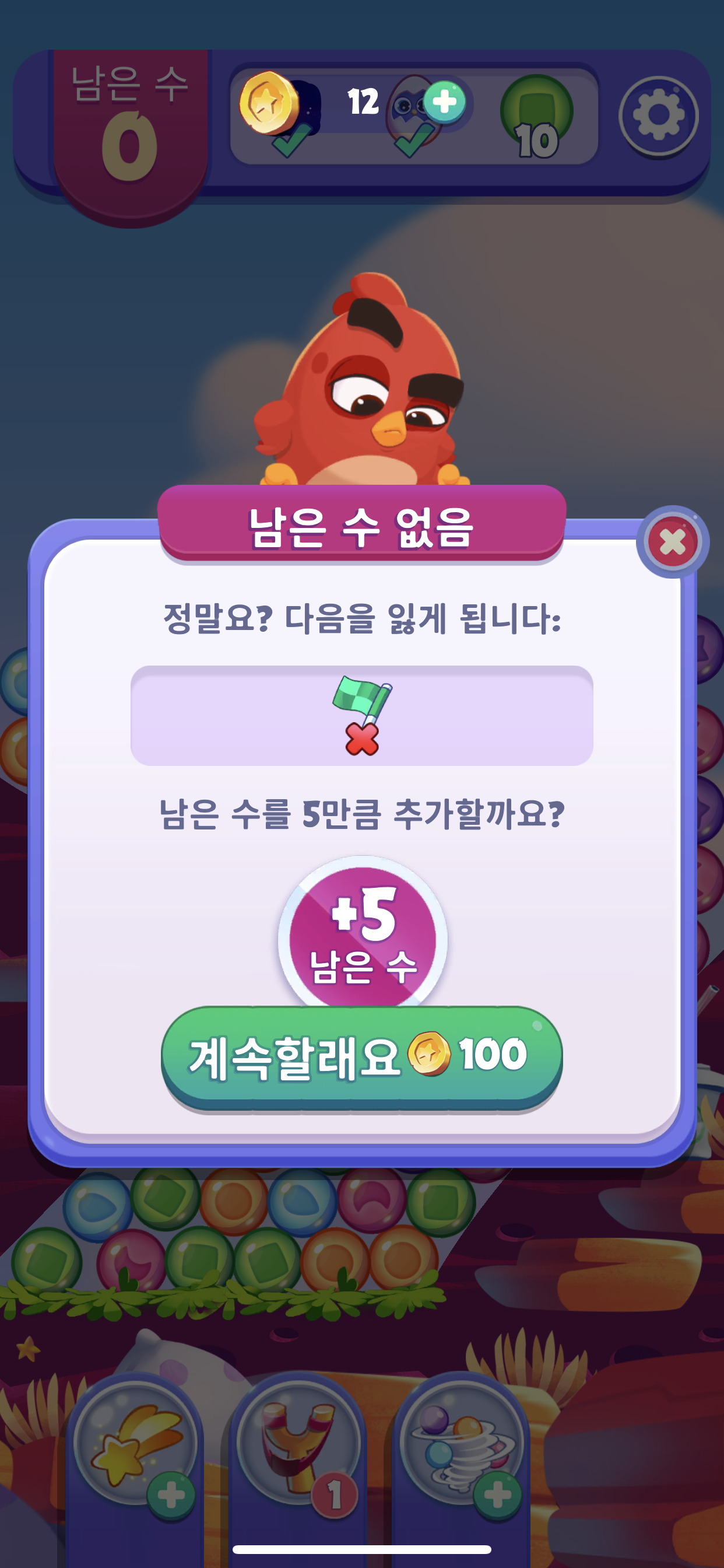 게임의 시간제한이 따로 없기 떄무넹 마음이 시간에 조마조마하지 않다는 것이 큰 장점이다. 하지만 화면 상단에 보면 남은수라고해서 숫자가 보이는데 내가 터치를 할 수 있는 수이기 때문에 그 수안에서 한 게임을 깨야 한다는 제한은 걸려 있다. 그리고 남은수를 모두 사용해서 0이 되게 되면 오른쪽 이미지 처럼 남은수 없음 남은수를 5만큼 추가할까요? 라는 창이 뜨면서 계속하기위해서는 100골드를 납부하라고 한다. 100골드를 내고서 한판을 깨기에는 너무 아까운데, 왜냐하면 재시작으로 다시 하게되면 50골드에 하트를 5개나 받을 수 있기 때문이다. 게임을 하는 사람이 선택을 해야 하는 부분이다보니 약간 애매하기는 하지만 내 개인적으로는 남은수를 5만큼 추가하는 것 보다 50골드로 5개의 하트를 받아서 5번이나 더 재시도를 할 수 있는 재시도로 골드를 사용하는 것이 더 유익한 것 같다.
