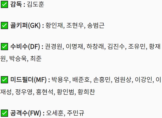 ✅ 교체출전 : 황희찬, 배준호, 박승욱, 오세훈, 엄원상